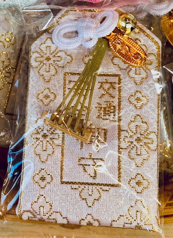 交通安全と刺繍された白色と金色を基調とした巾着袋に封入された何とも雅なお守り♡
