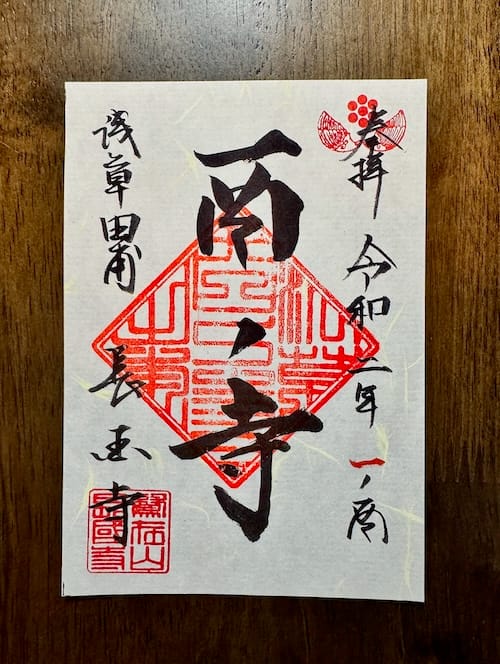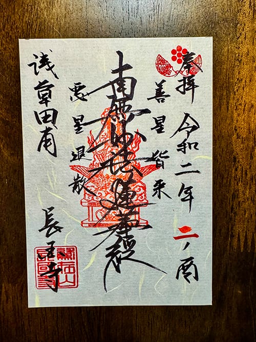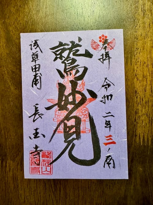 右端に参拝日、左端に「浅草田甫 長國寺」の墨書き。
