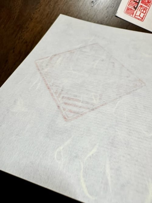 あとで気づいたのだが、インク移りしないように紙を上に乗せていたのだが、墨と御朱印紙の材質が影響してか、紙が引っ付いて取れなかった。