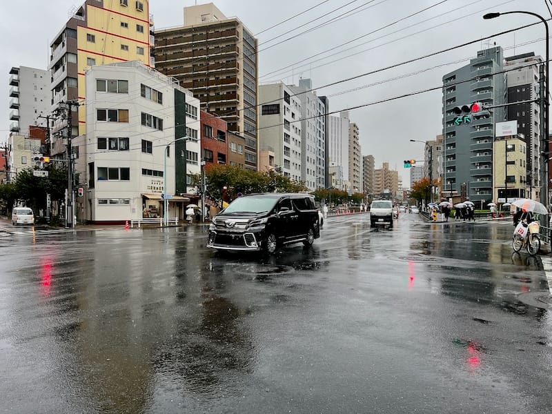 午後14時前の金美通と国際通の合流地点(千束2・3丁目交差点)の様子