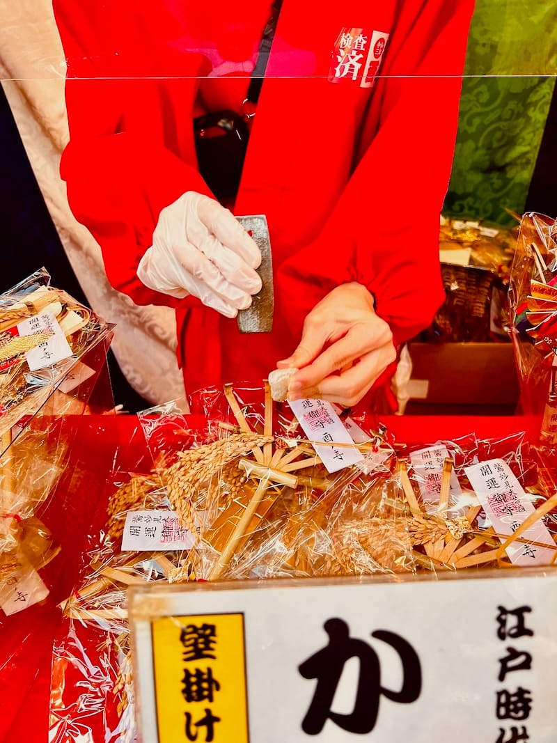 当日、鷲神社で授与している かっこめ や熊手をルンルン♪気分で購入すると、漏れなく下掲写真のような火打石でお清めした形で授与して‥いただけちゃぅ。